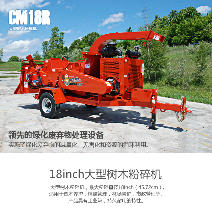 大型樹木粉碎機,最大粉碎直徑18inch(45.72cm),適用于樹木養護,植被管理,林場管護,市政管理等。產品具有工業級,持久耐用的特性。